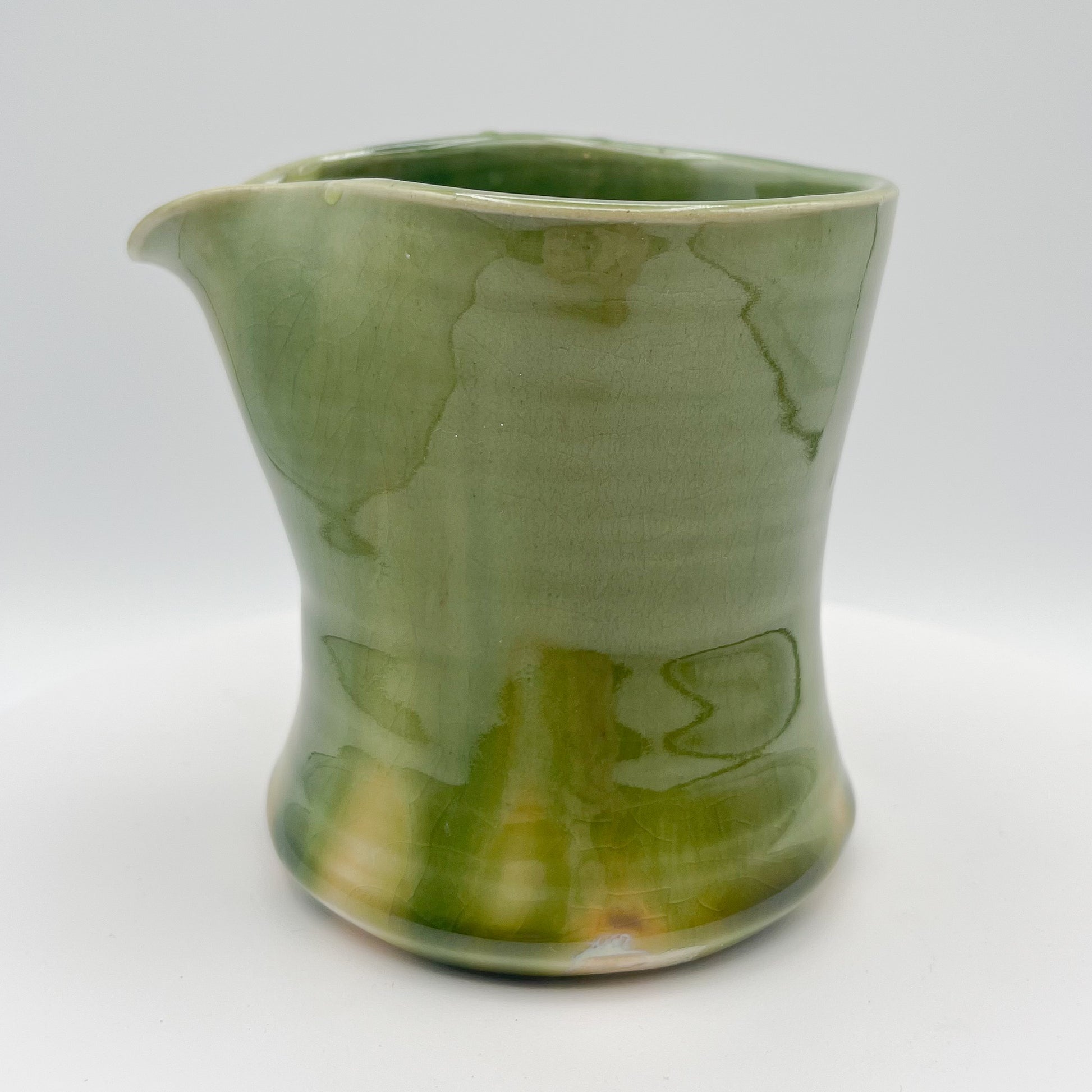 This unique handless-thrown ceramic creamer is perfect for serving your morning coffee. The glossy, soft moss green, with its silky surface, makes it a beautiful statement piece for your kitchen or dining room.