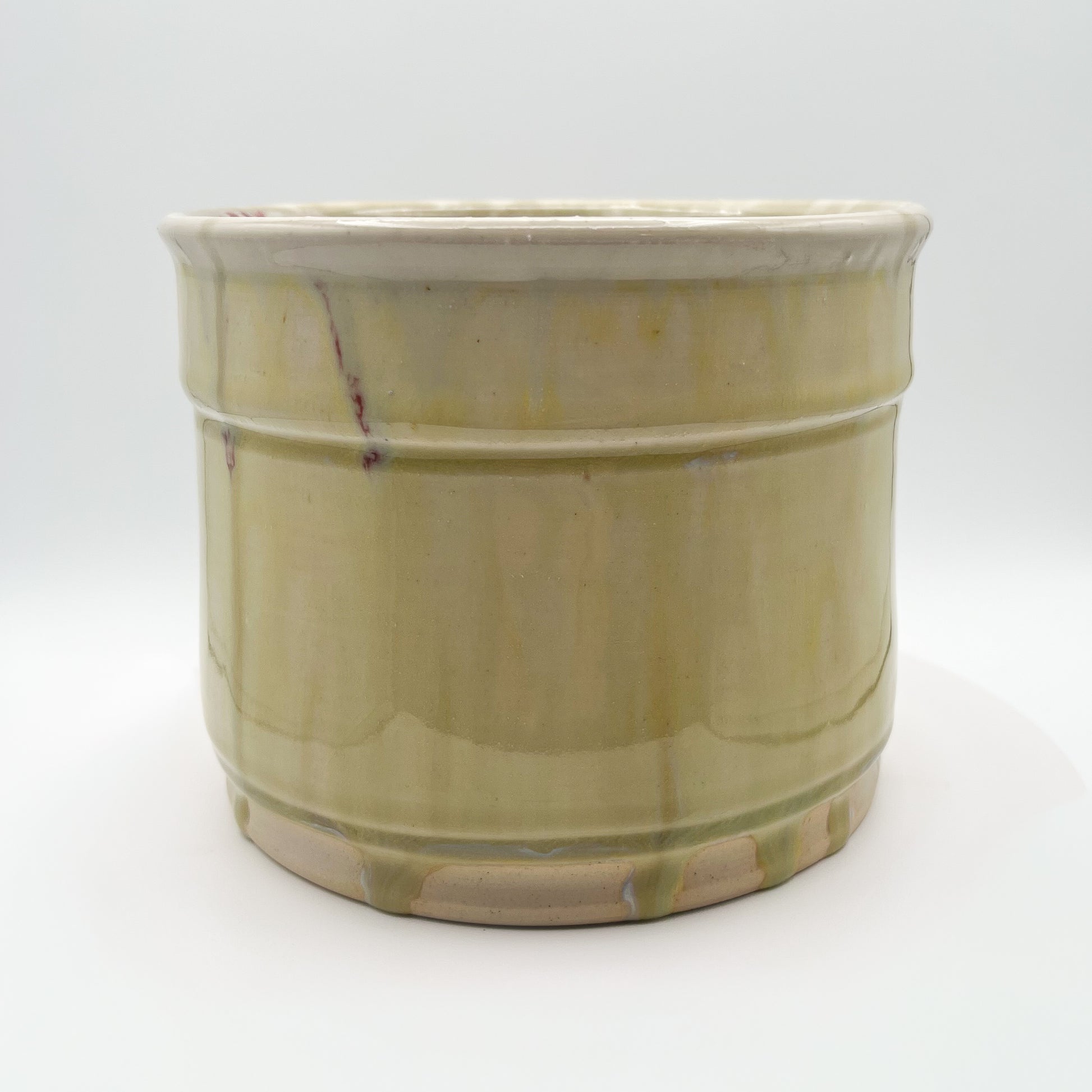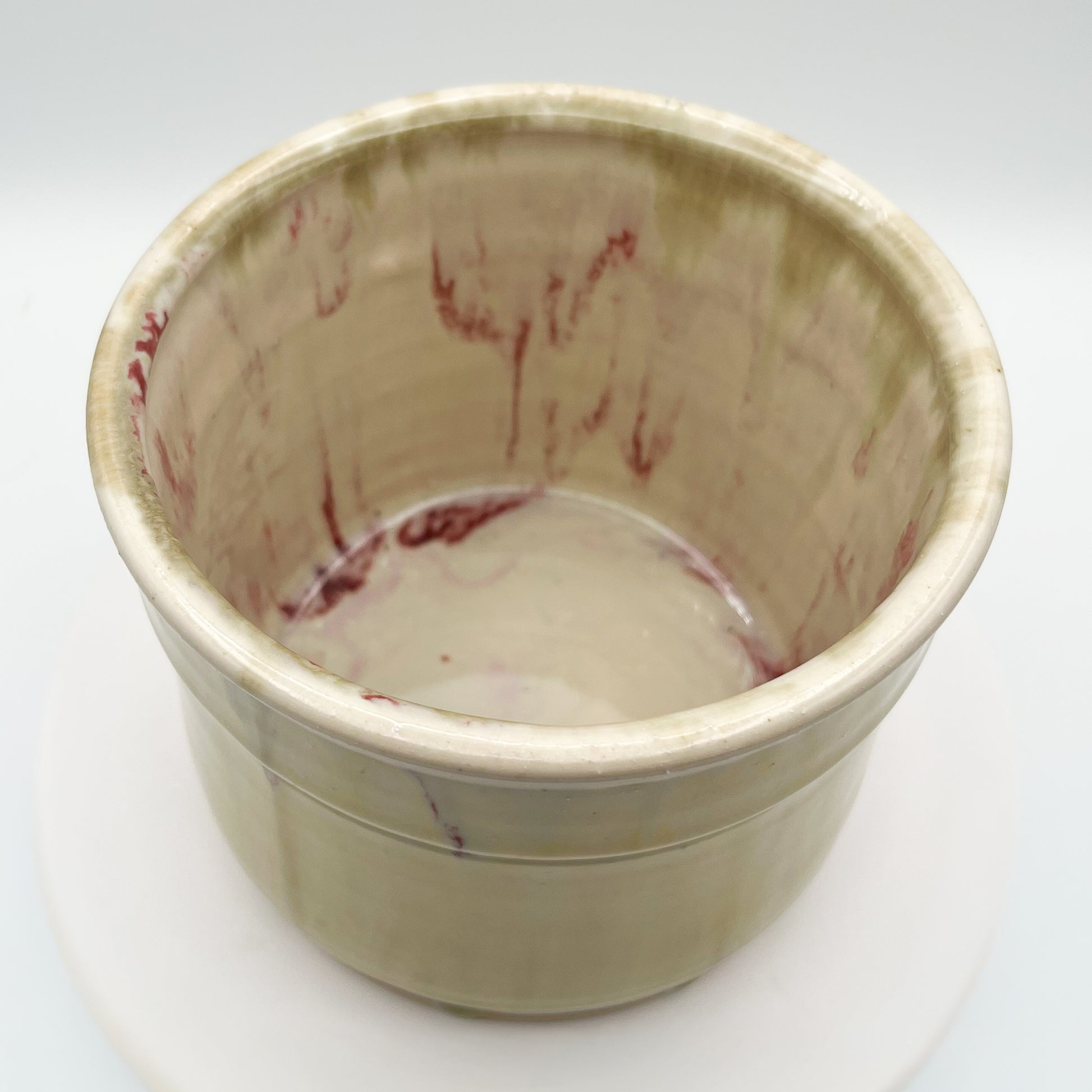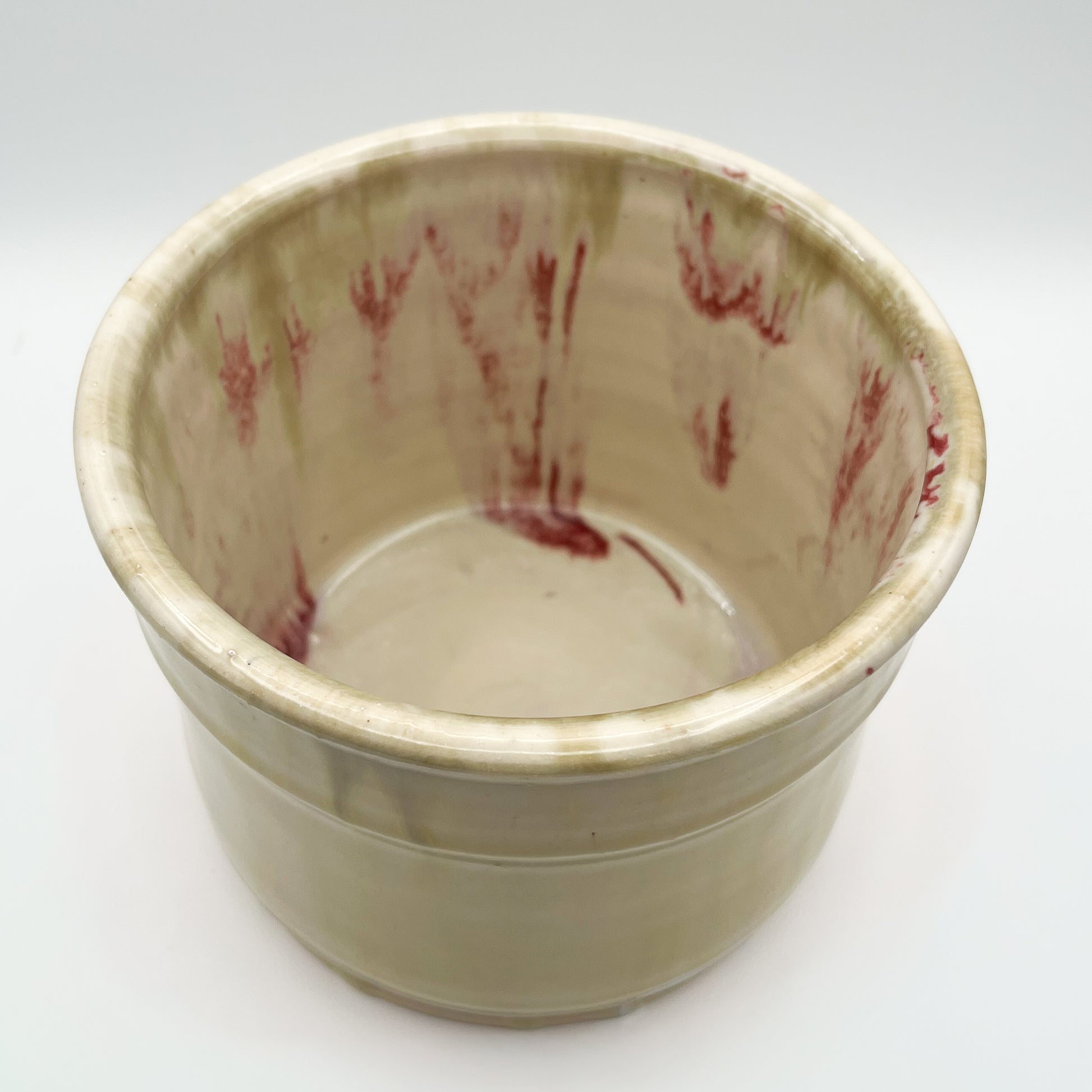 This stoneware utensil holder is glazed in a creamy white and yellow glaze with accents of burgundy. This dreamy ceramic creation is almost too pretty to use... almost.