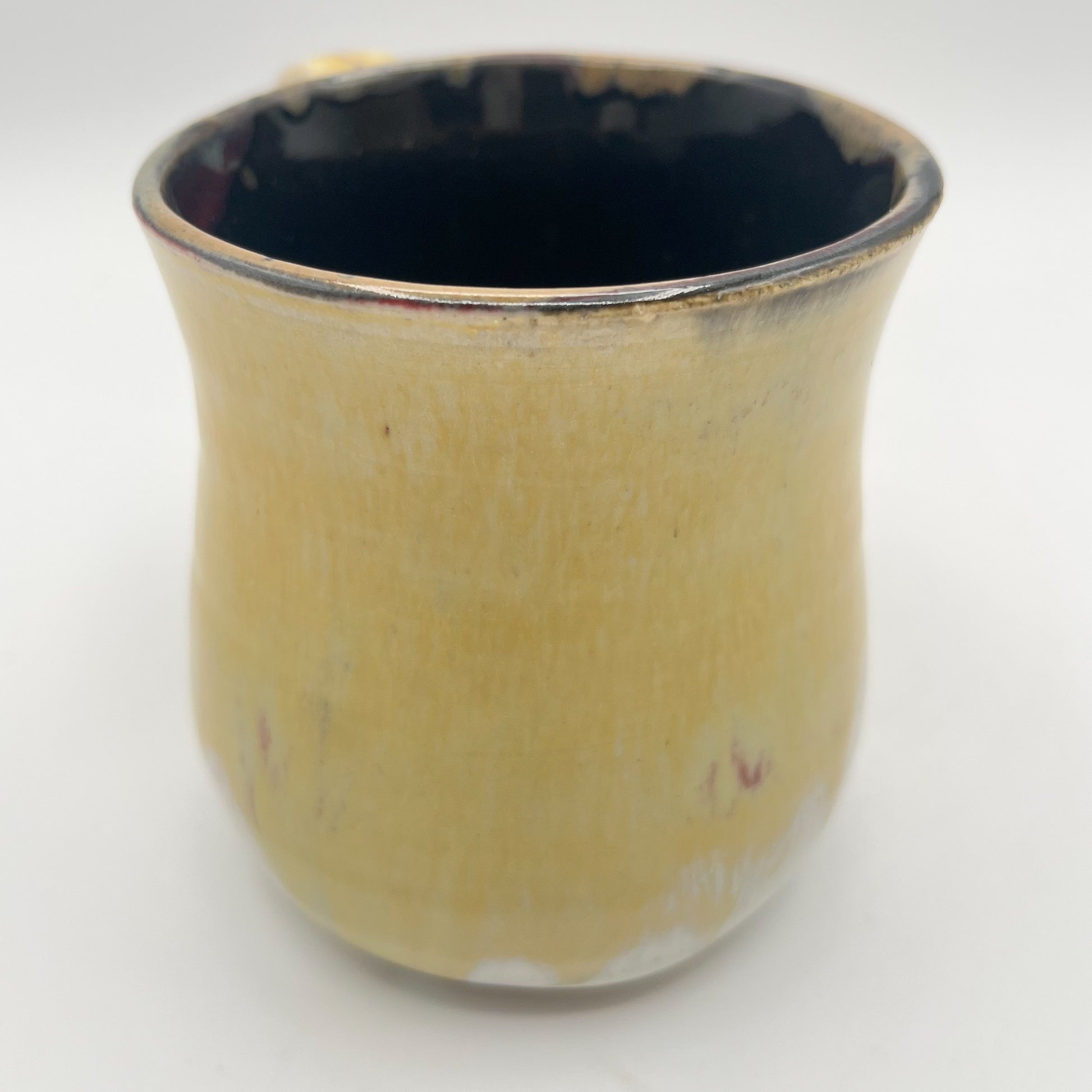 This hand-crafted ceramic mug features a unique, flowing glaze in warm yellows and contrasting dark accents. Wrap your hands around warmth. This charming mug, with its comfortable handle and inviting colors, is perfect for enjoying your favorite hot beverage on a chilly day.