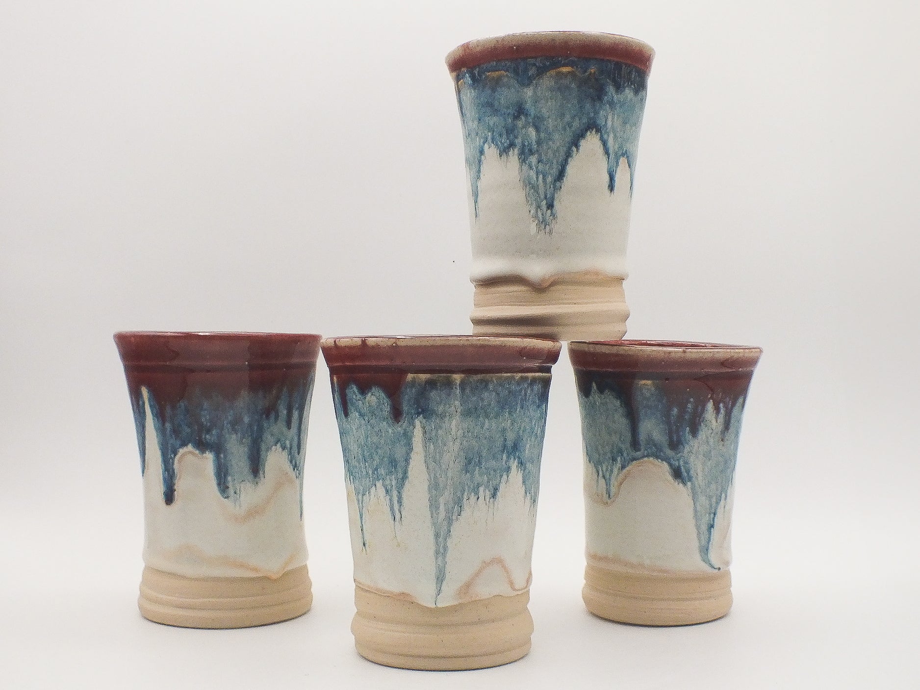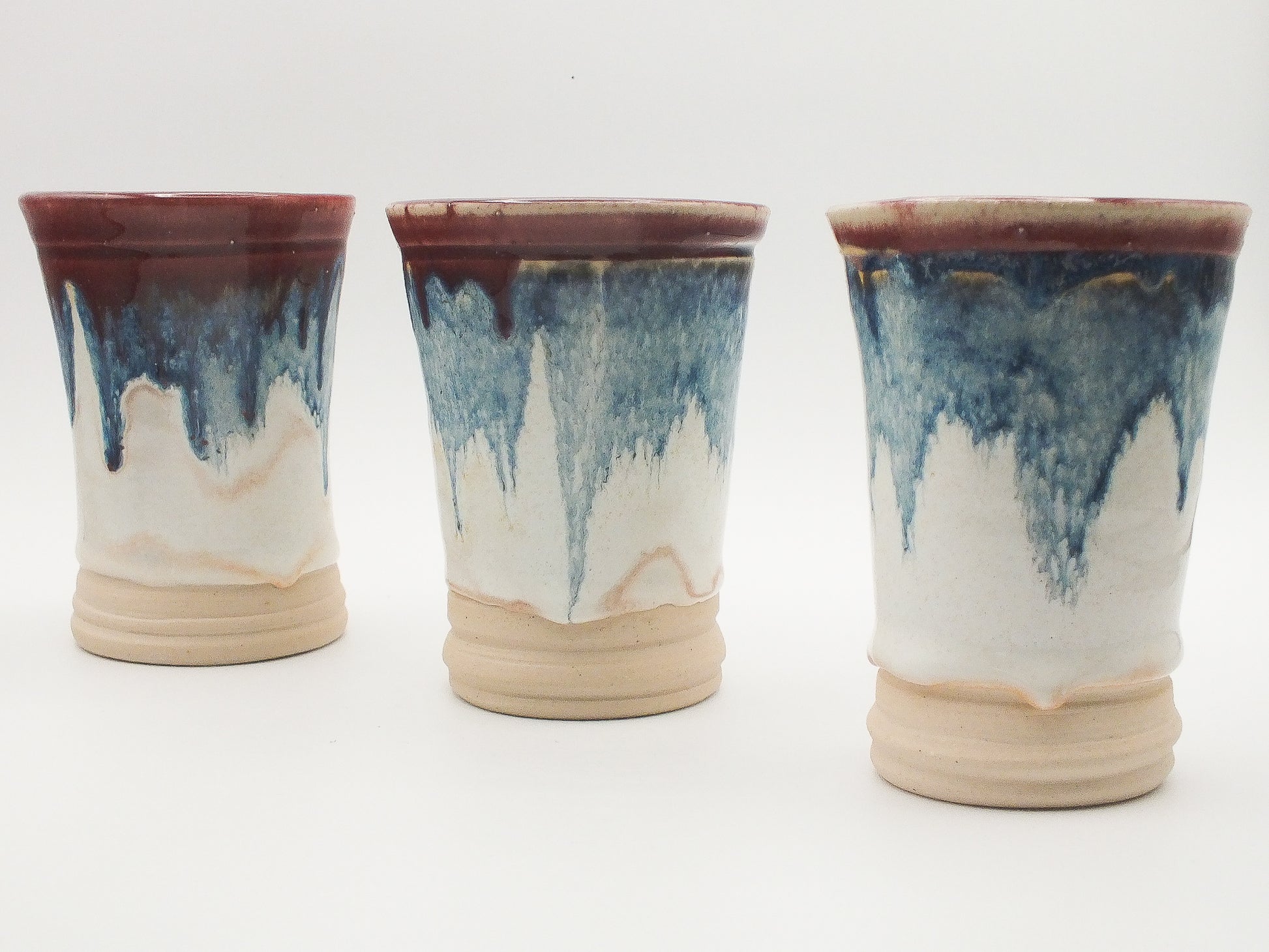 These stunning tumblers are more than just vessels; they're works of art. Each one features a unique, mesmerizing blend of deep reds, ocean blues, and creamy off-whites, creating a captivating visual experience. The vibrant red interior adds a touch of unexpected brilliance to every sip.