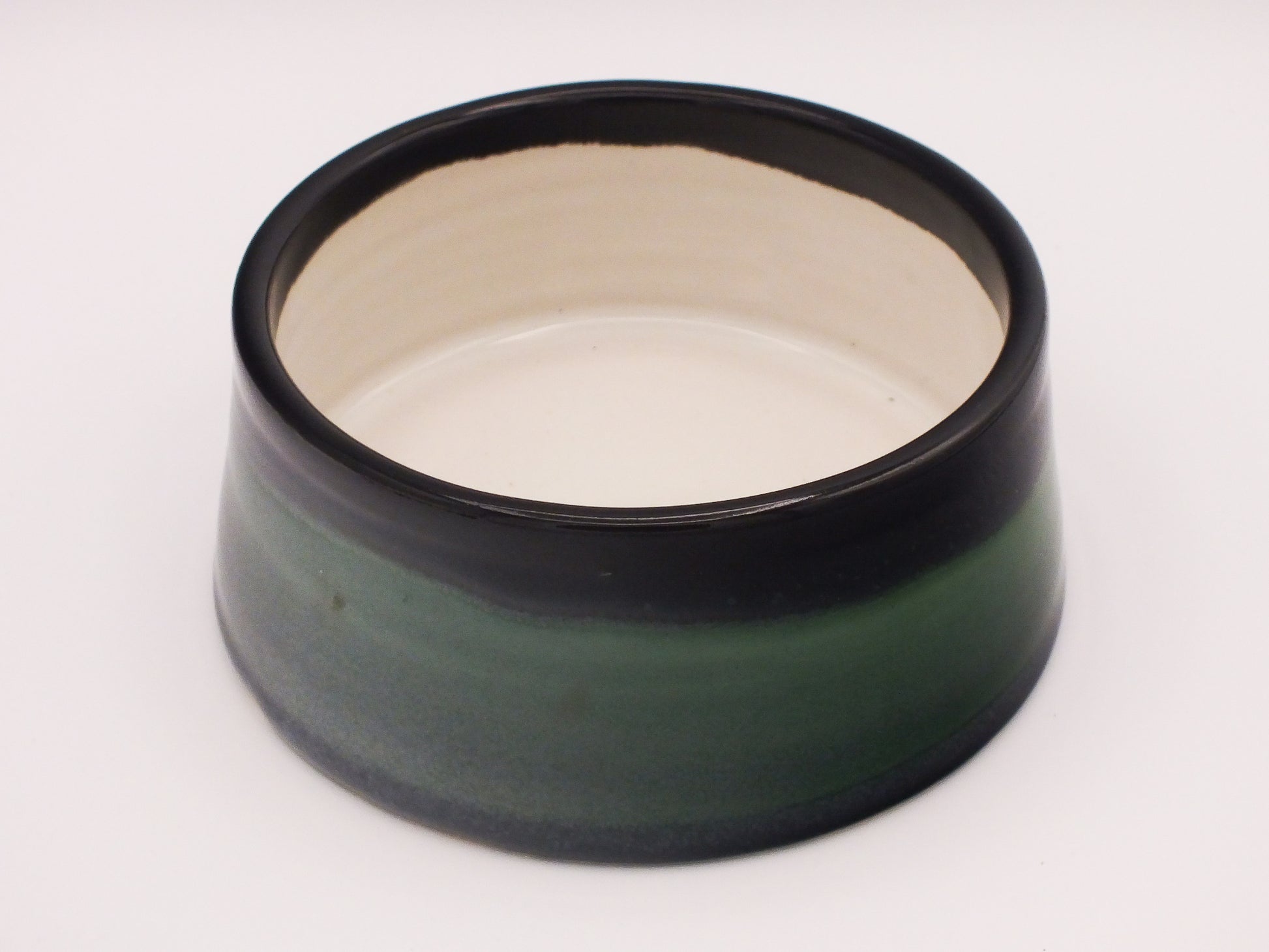 The exterior of the bowl is glossy emerald green with a black rim, and white interior over white stoneware.