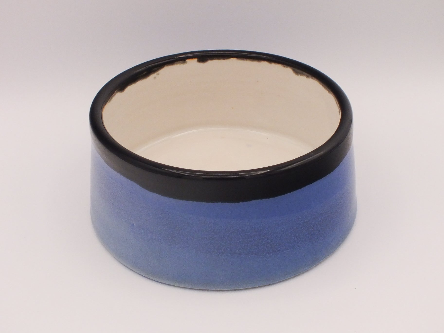 The exterior of the bowl is glossy blue with a black rim, and white interior over white stoneware.