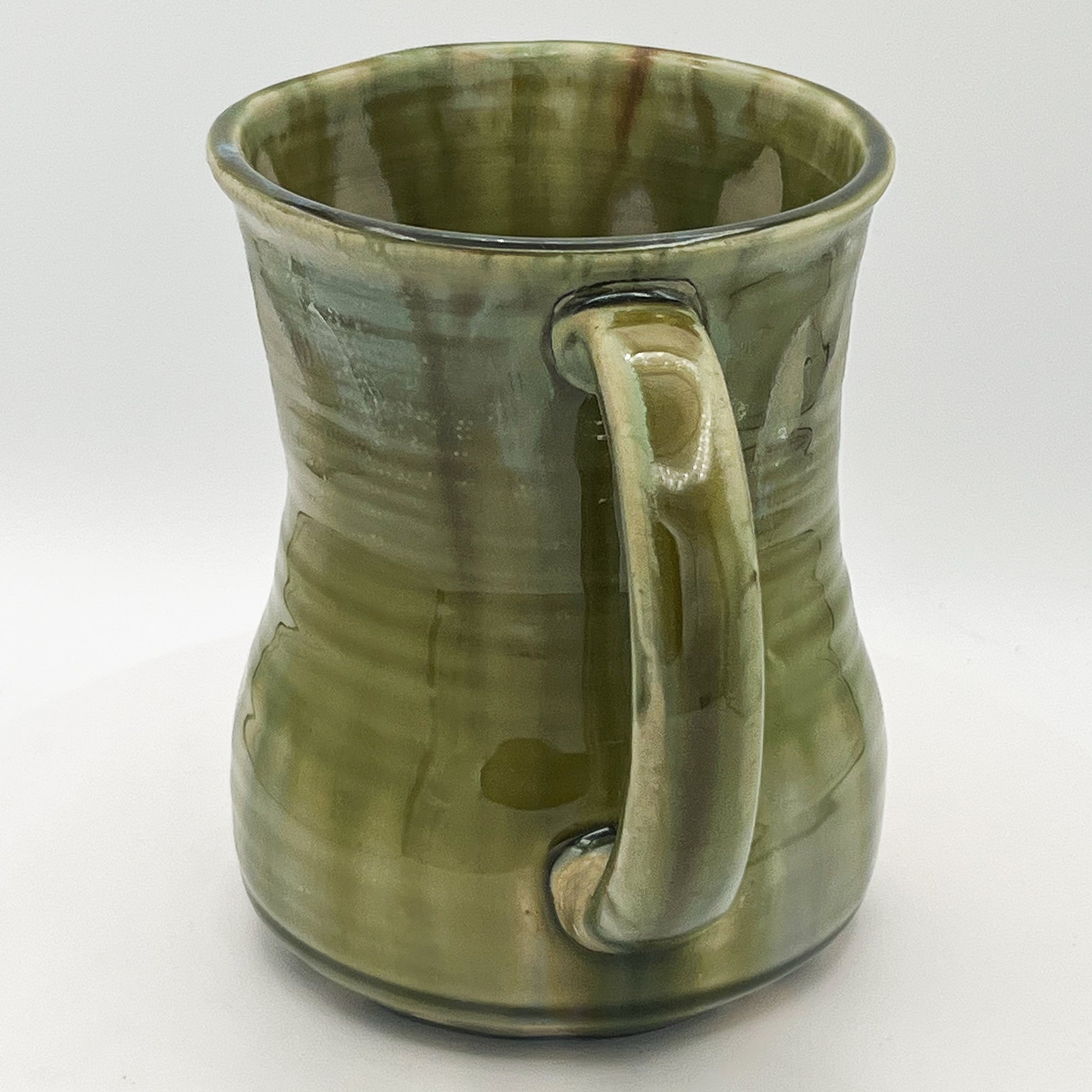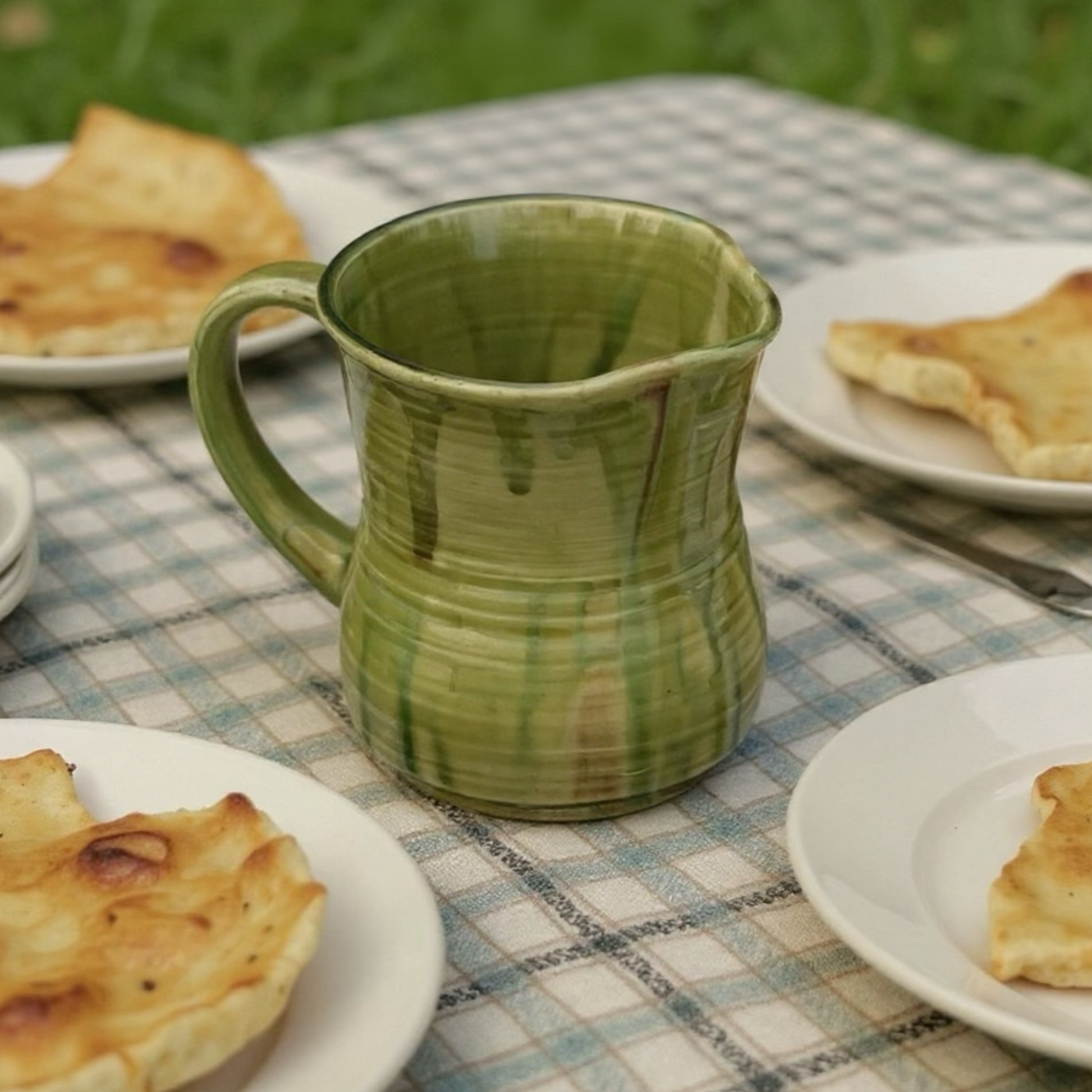 Enjoy this handcrafted ceramic pitcher with a beautiful green and cream glazes featuring a unique watercolor-like effect, with shades of grass, moss, and soil. The pitcher has a slightly curvaceous body and a softly curved handle. The overall style is rustic and elegant, ideal for adding a touch of handcrafted charm to any kitchen or dining setting.