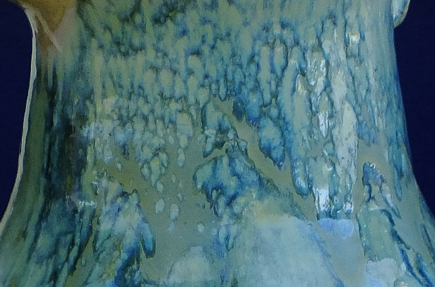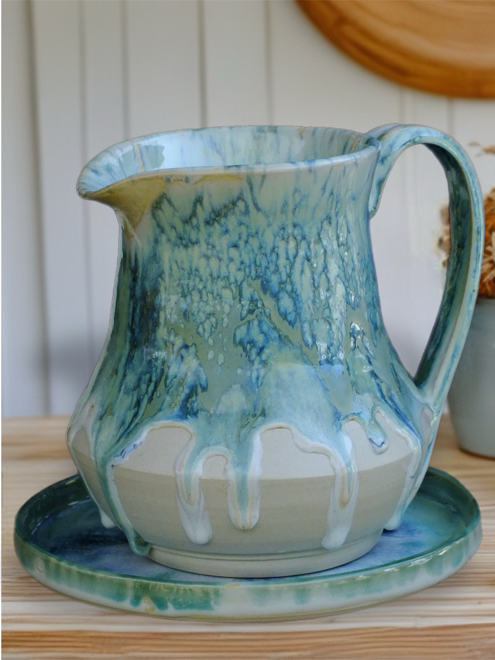 Enjoy this ceramic pitcher and matching plate for beverage service or displaying cut flowers. The pitcher has been thrown with an irregular shape and flared rim. Its surface has a glaze with flowing, dripping patterns in shades of blue, green, and white, blending to create a natural, watercolor-like effect. The pitcher's base is unglazed, revealing beige ceramic below.