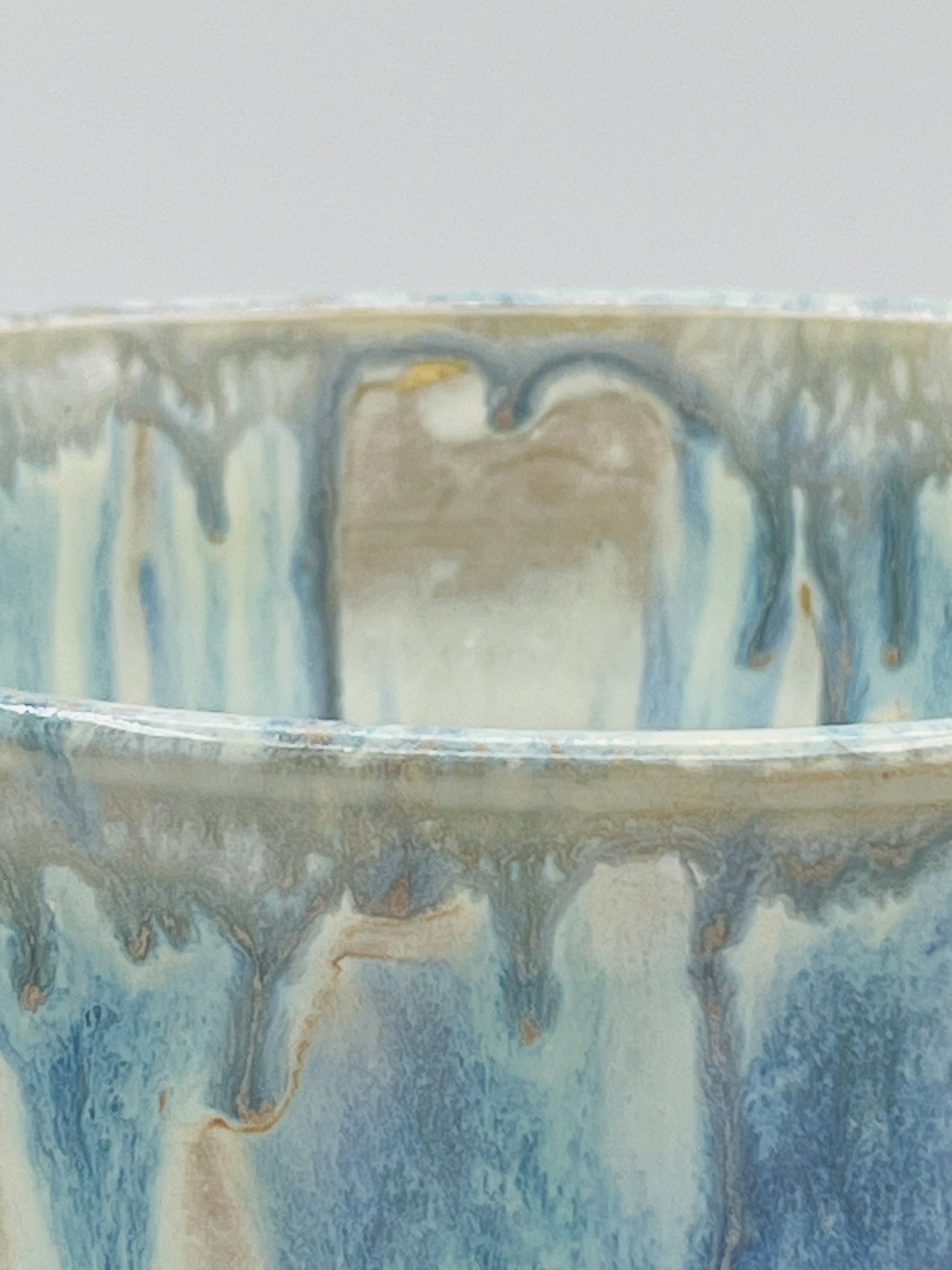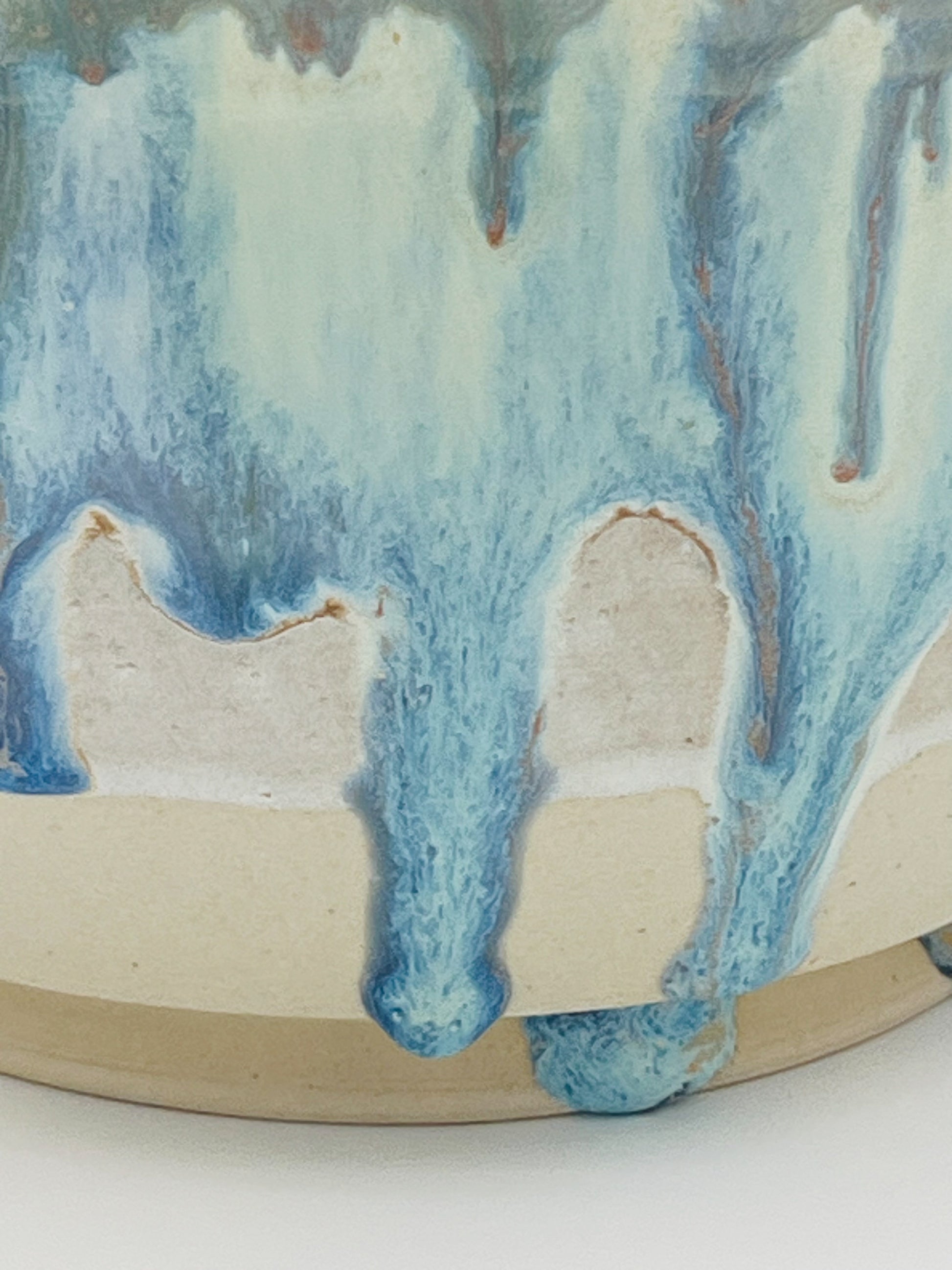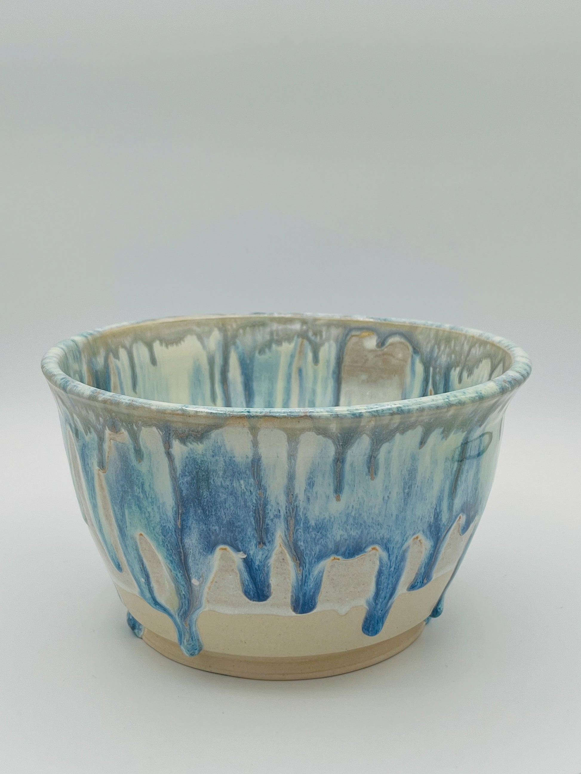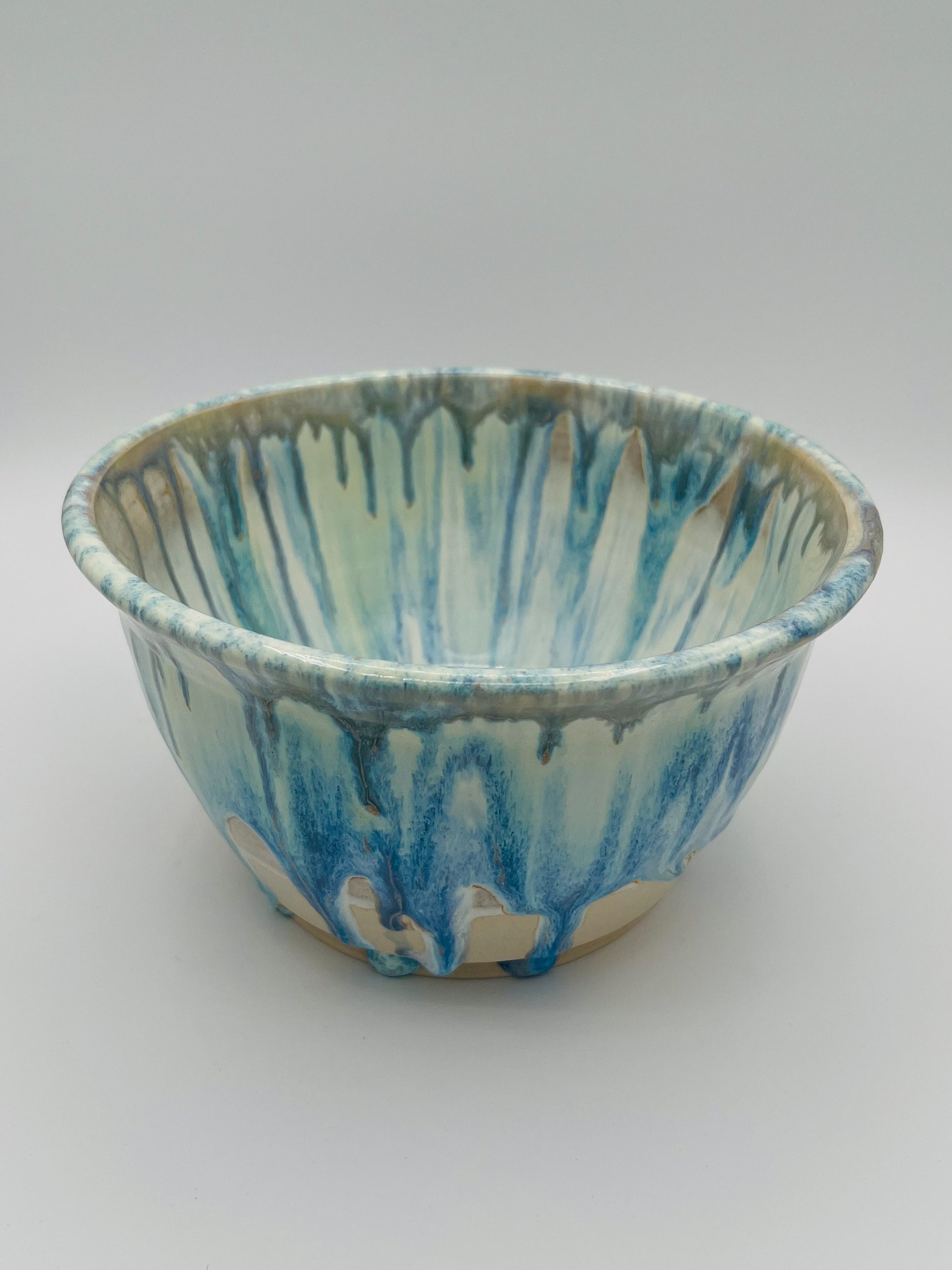The ceramic bowl is a handcrafted piece with a striking and artistic glaze design. The bowl features a smooth, rounded shape and a medium depth. The glaze on the exterior has a flowing, drip-like effect in shades of blue and green, blending into a creamy white base. The drips create a dynamic texture and visual interest. The glossy finish enhances the depth and richness of the colors. This bowl is both functional and decorative, with an artistic design that highlights the craftsmanship involved in its creation.