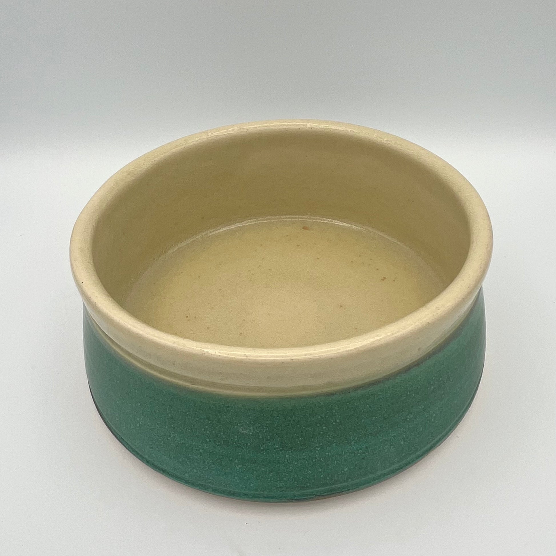 The exterior of the bowl is matte green, and the interior it a clear glaze over the white stoneware.