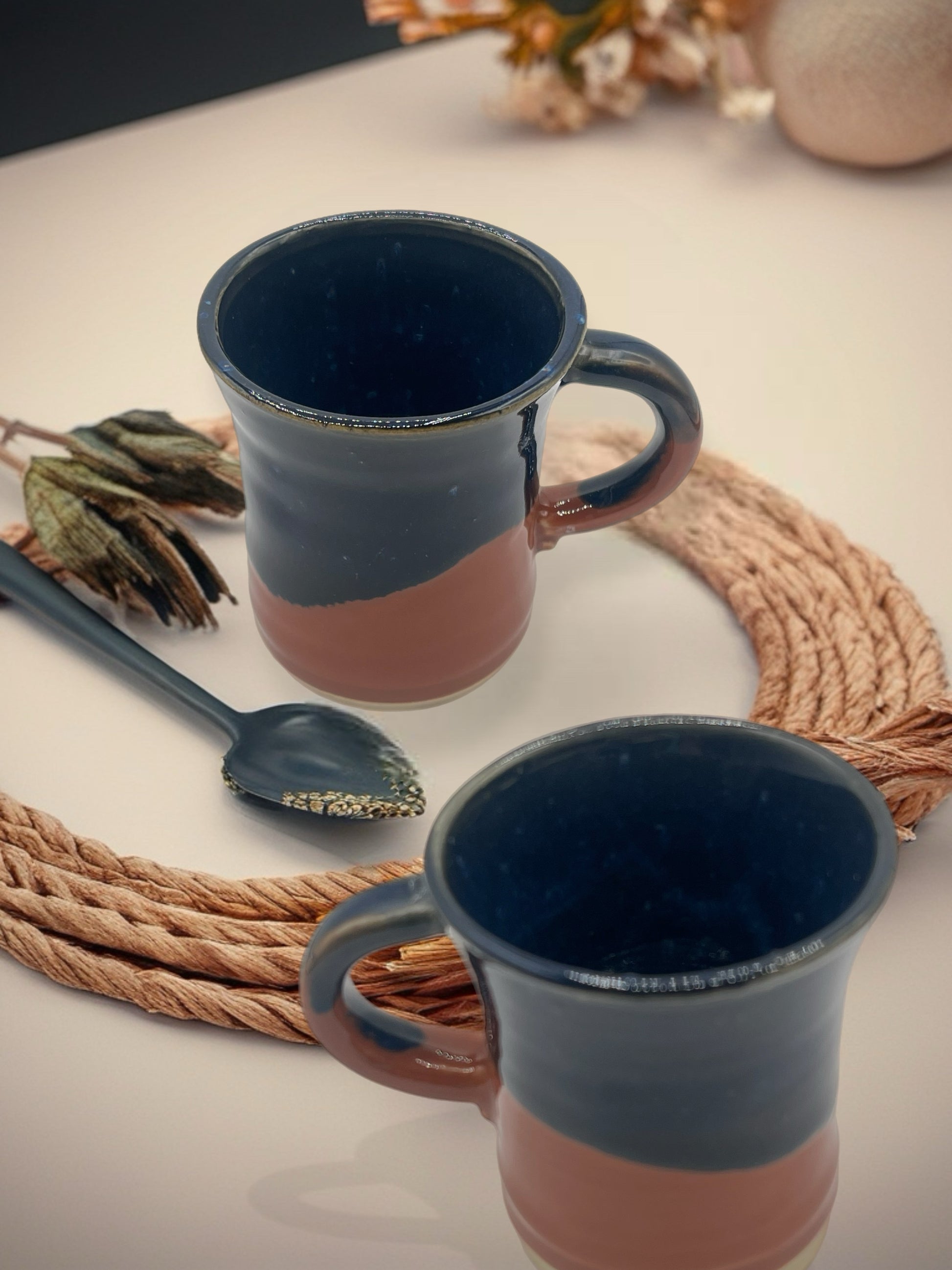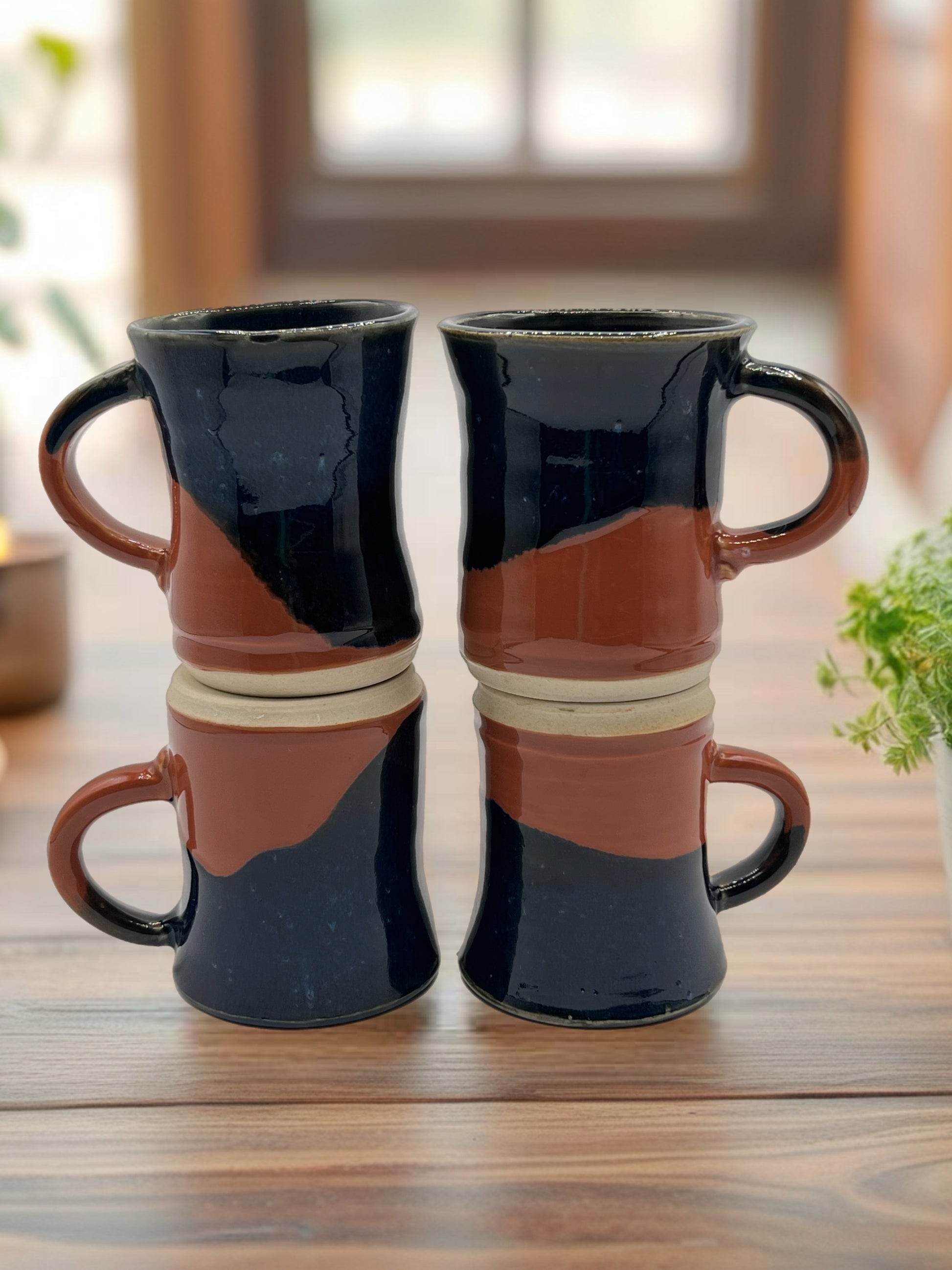Enjoy your espresso in style with these charming demitasse mugs, handcrafted from smooth white stoneware. Each mug features a unique splash of color, with a rich dark blue and earthy terra cotta glaze blending beautifully together. The small size is perfect for a strong shot of espresso or a small coffee, and the unique, handmade quality makes each sip feel special.